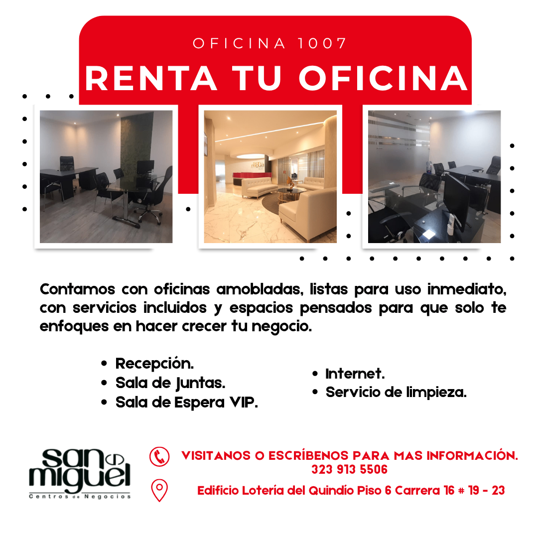¡Arrienda tu oficina totalmente amueblada! Ubicadas en el corazón de Armenia, nuestras oficinas están listas para que trabajes con comodidad, imagen profesional y todo lo que necesitas en un solo lugar. - Oficinas amobladas - Recepción - Internet - Sala de juntas - Sala de espera VIP 📍 Centro – Edificio Lotería del Quindío Piso 6 📲 Escríbenos ahora y agenda tu visita 📞 323 913 5506