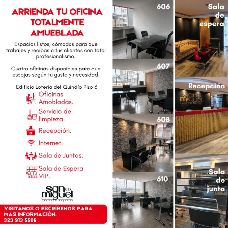 Oficinas por horas en Armenia. Trabaja con comodidad y profesionalismo en el corazón de la ciudad. Oficinas totalmente equipadas, listas para que desarrolles tus actividades sin preocupaciones. Alquila por horas o por día y disfruta de espacios modernos, seguros y con todos los servicios incluidos. Comunícate al 323 913 5506 Sedes en Pereira, Manizales y armenia. - Oficinas amobladas - Recepción - Internet - Sala de juntas - Sala de espera VIP