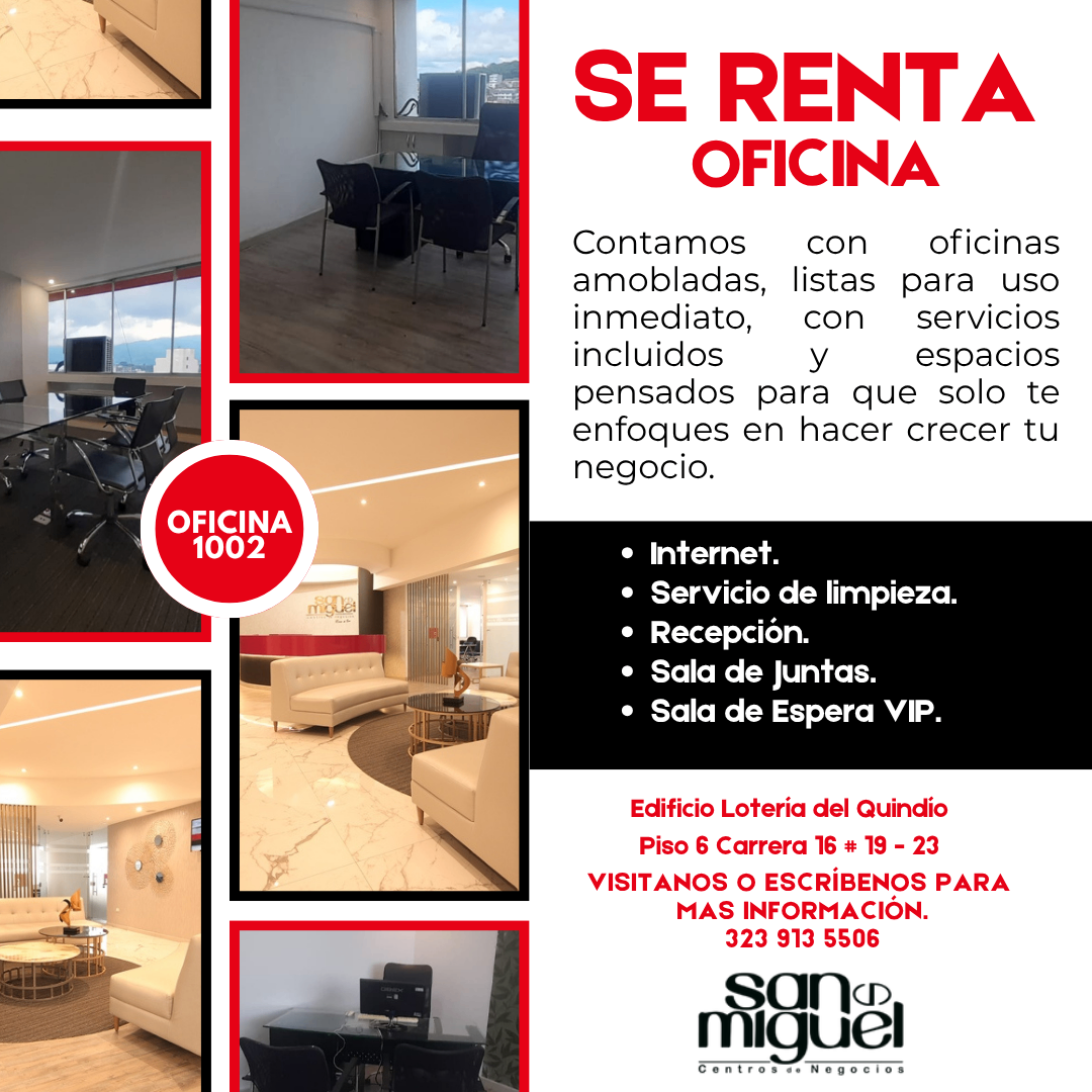 Renta Tu Espacio de Trabajo en Armenia te Espera. ¡Haz que tu negocio crezca con nosotros! Ofrecemos oficinas amobladas en la zona céntrica de Armenia, en el edificio Lotería del Quindío. Con acceso a internet Sala de espera VIP Recepción Tendrás todo lo necesario para tu éxito. Comunícate al 323 913 5506 para más detalles También contamos con sedes en Pereira y Manizales.
